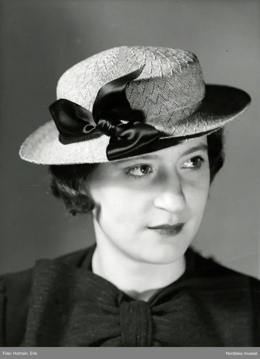 Kvinnlig modell i hatt med dekorband. Nordiska Kompaniet, Stockholm.