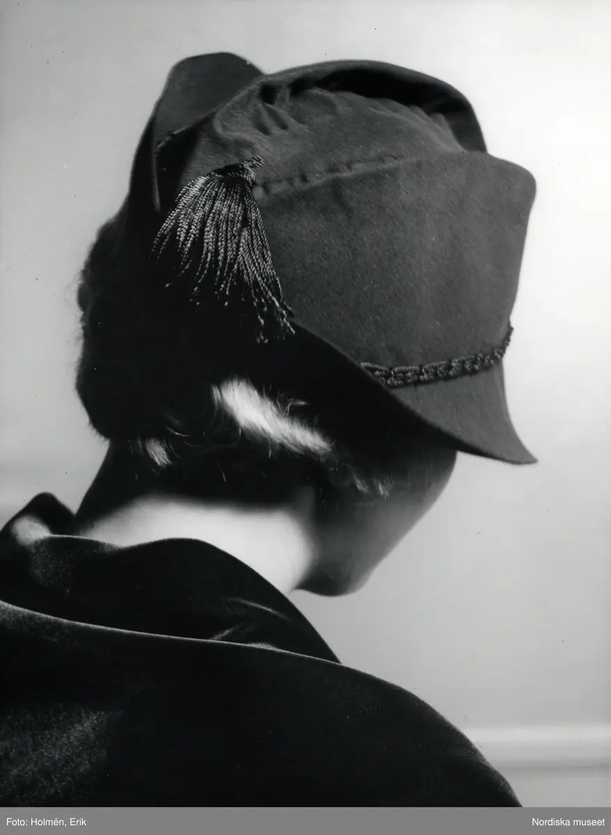 Kvinnlig modell i hatt från Jean Patou. Nordiska Kompaniet, Stockholm.
