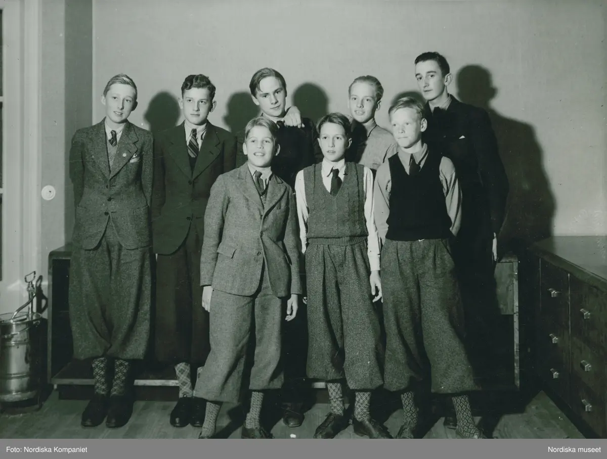 Pojkar i kavaj, skjorta, slips, pullover och äppelknyckarbyxor, står uppställda på rad.