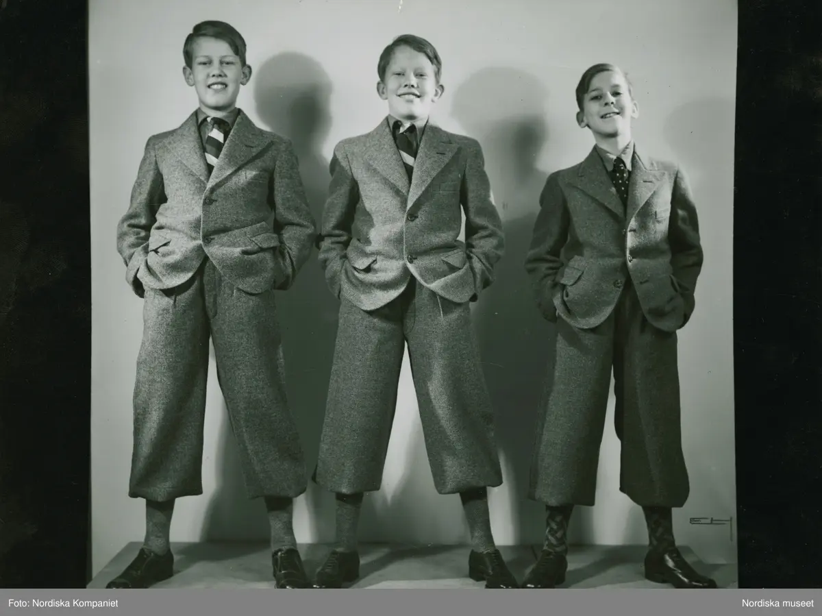 Gosskonfektion, Skolungdom. Tre pojkar i skjorta, slips, kavaj, äppelknyckarbyxor, strumpor och snörskor.