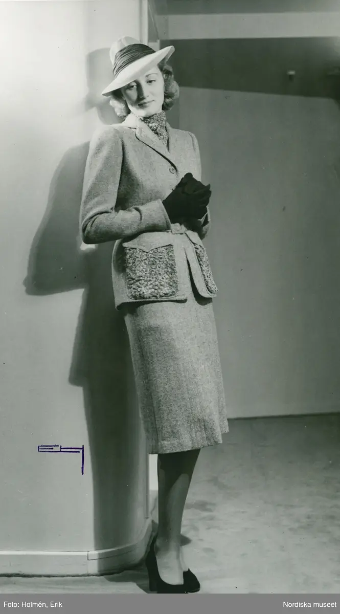 Helporträtt av kvinna i dräkt, hatt och handskar.