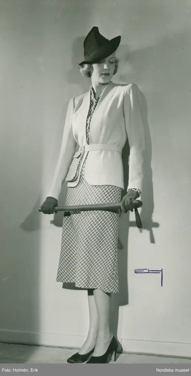 Helporträtt av kvinna i dräkt, hatt, handskar och pumps.
