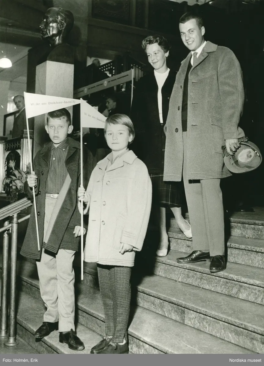 En Doktor-familj klädd i ytterkläder i trappan på Nordiska Kompaniet.