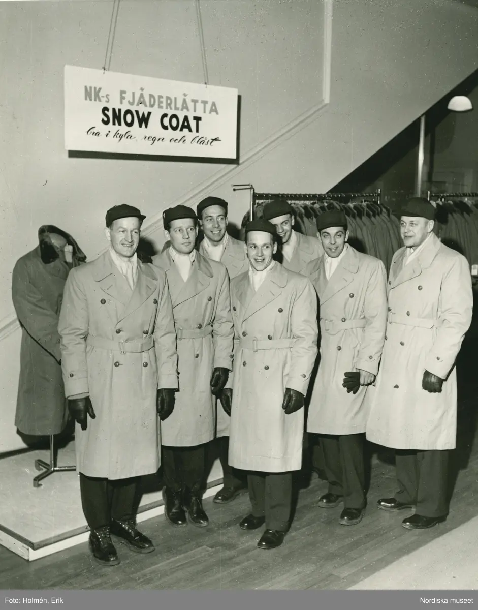 Grupporträtt av backhoppare i trenchcoat och keps.