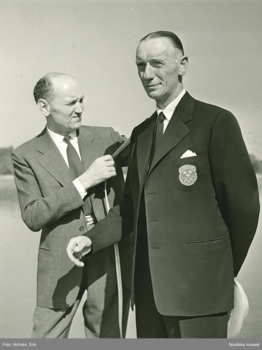 En skräddare tar mått på en man i olympisk dräkt vid vattnet.