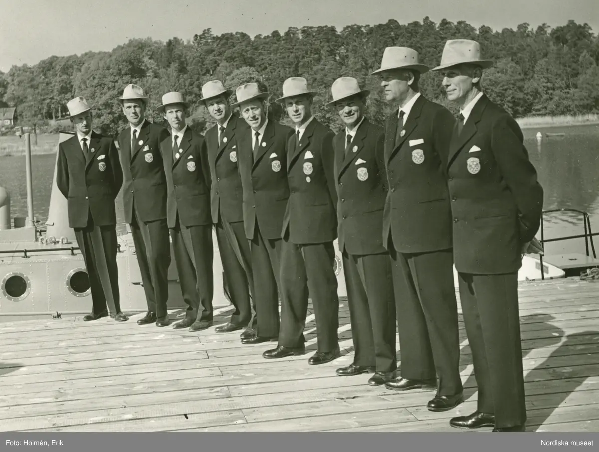 Grupporträtt av män i olympisk dräkt på en kaj.