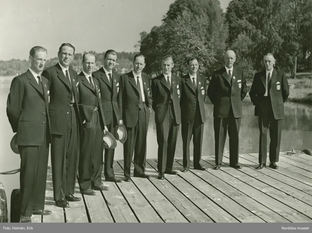 Grupporträtt av män i olympisk dräkt på en kaj.