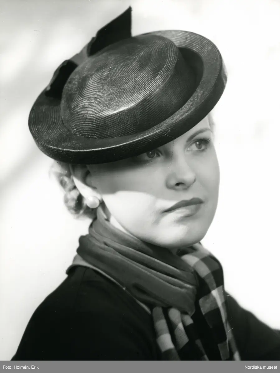 Kvinnlig modell i svart balibuntalhatt med garnering av svart grosgrain-band. Nordiska Kompaniet, Stockholm.