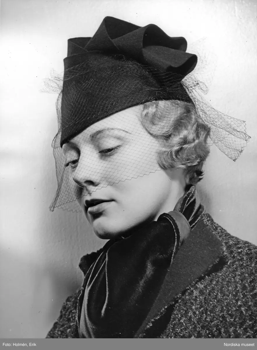 Kvinnlig modell i hatt med flor från Suzanne Talbot. Nordiska Kompaniet, Stockholm.