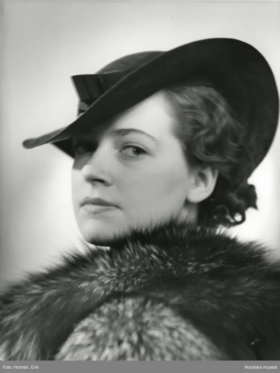 Kvinnlig modell i päls och hatt. Nordiska Kompaniet, Stockholm.