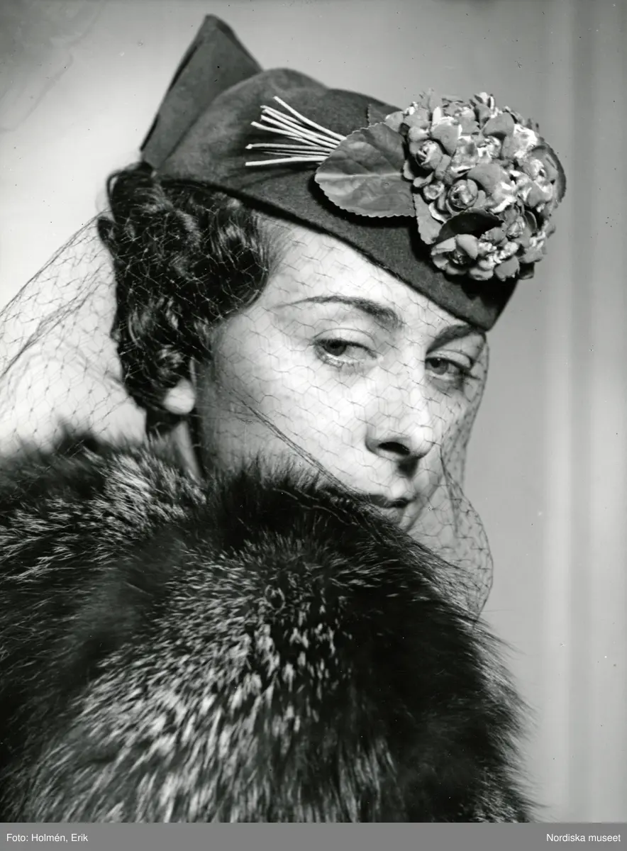 Kvinnlig modell med hatt av Suzanne Talbot. Mauvefärgad velour, med garnityr och flor. Nordiska Kompaniet, Stockholm.