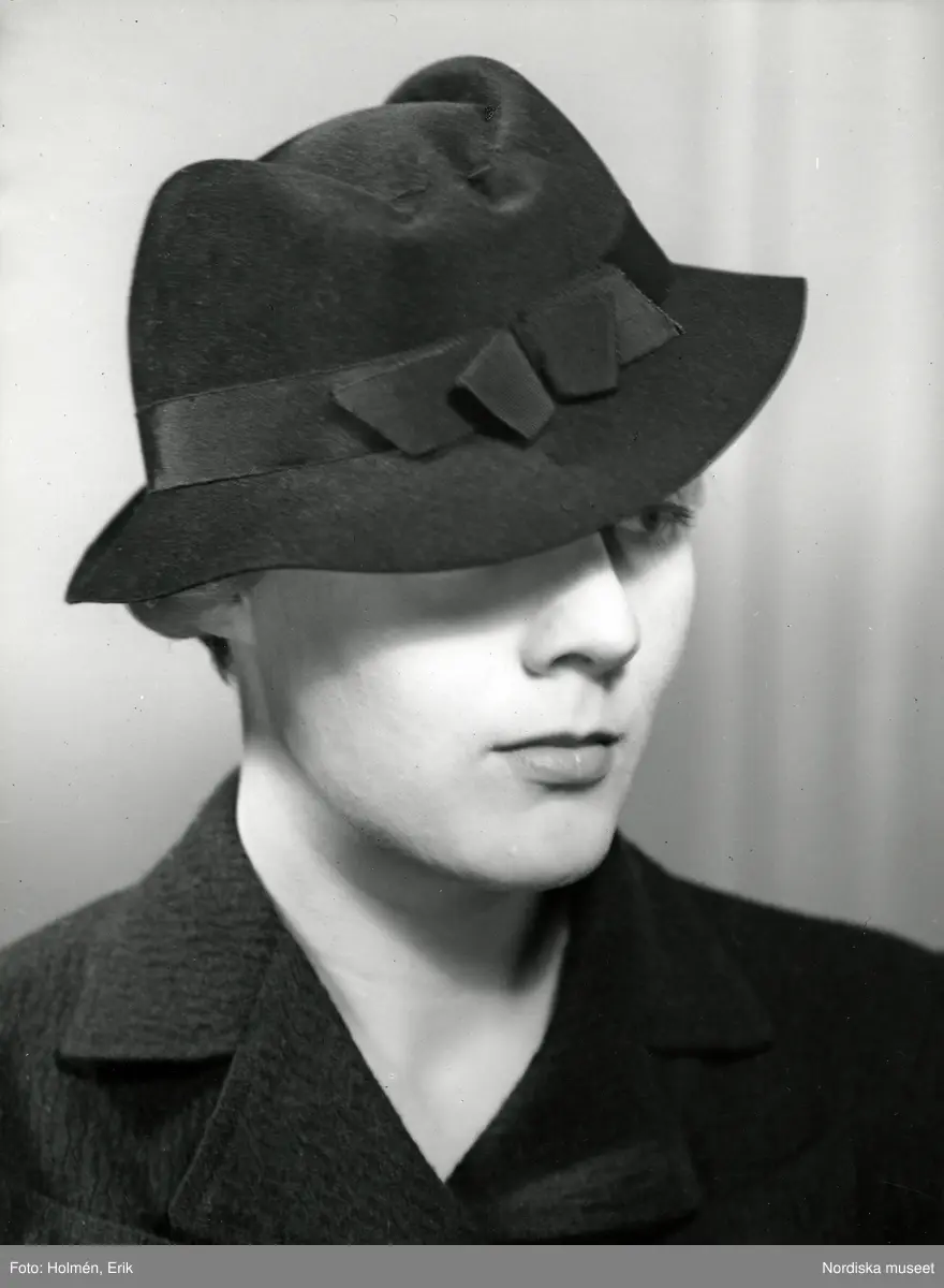 Kvinnlig modell i svart filthatt från Jean Patou. Nordiska Kompaniet, Stockholm.