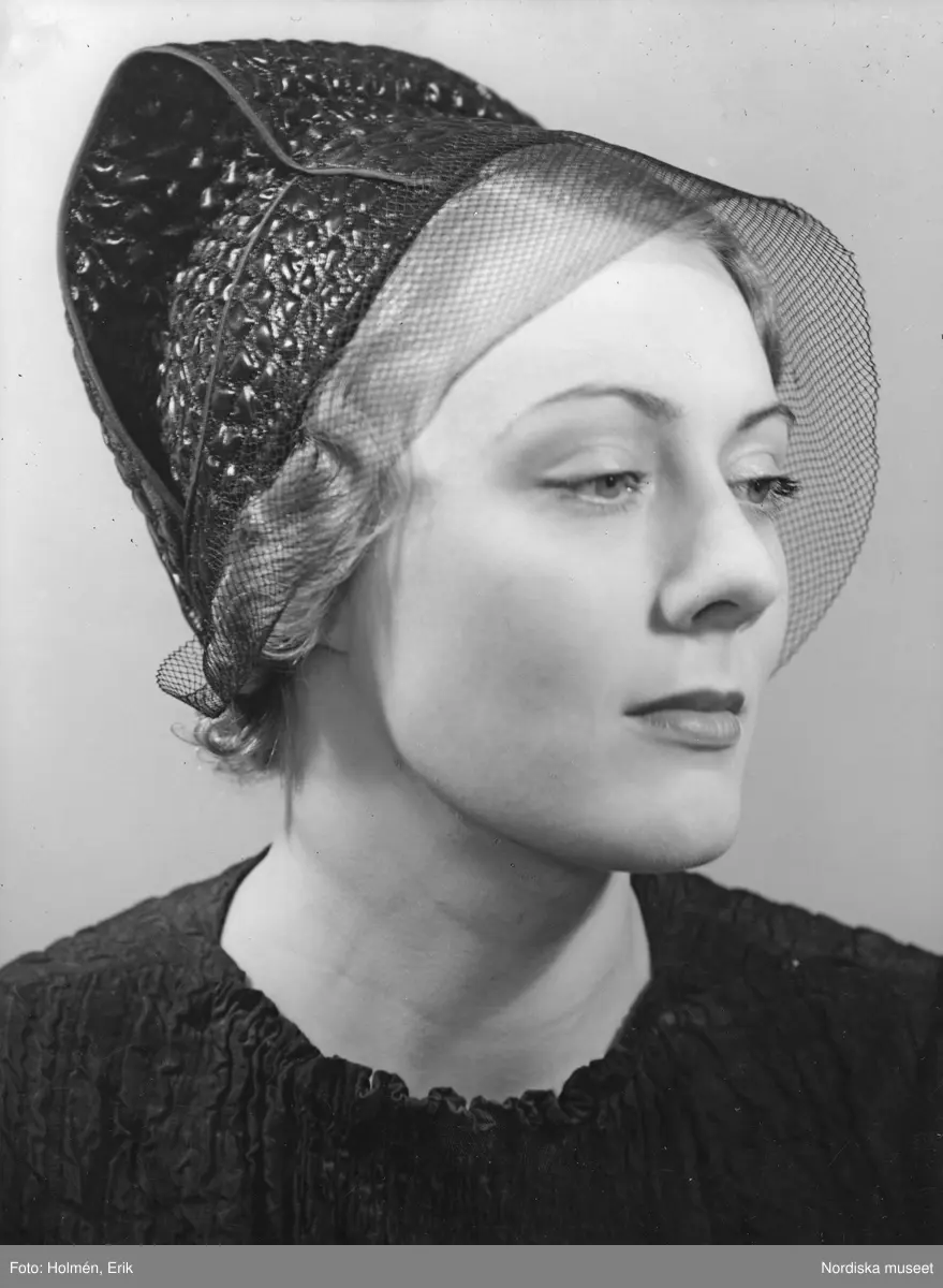 Kvinnlig modell i stråhatt med tyll. Nordiska Kompaniet, Stockholm.