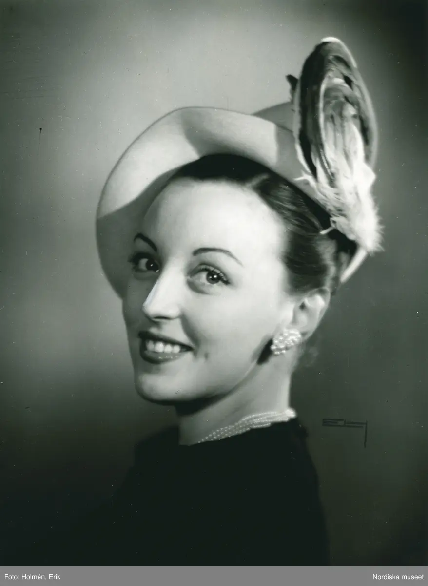 Porträtt av kvinna i hatt. Gråbeige filt med fantasi i samma färg. Uppvisning mars 1947. Hattar använda vid franska avdelningen.