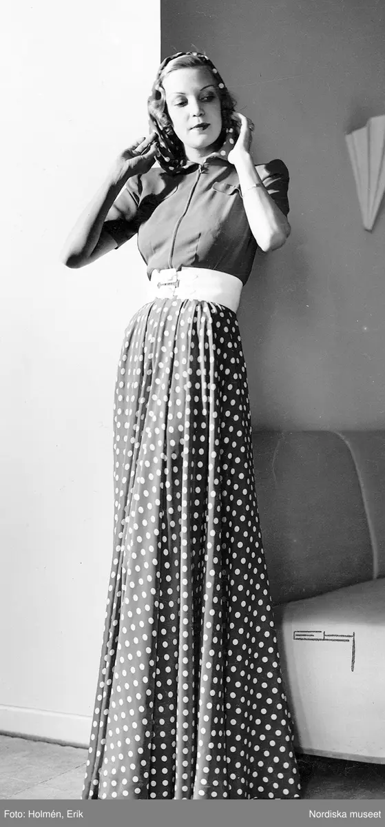 Modell i långklänning med prickig kjol, vitt skärp och prickig huva.