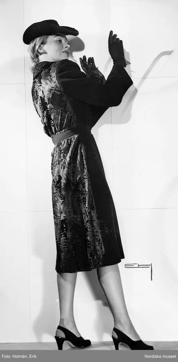 Modell i höstkappa i svart ylle med breitschwanz, hatt och handskar.