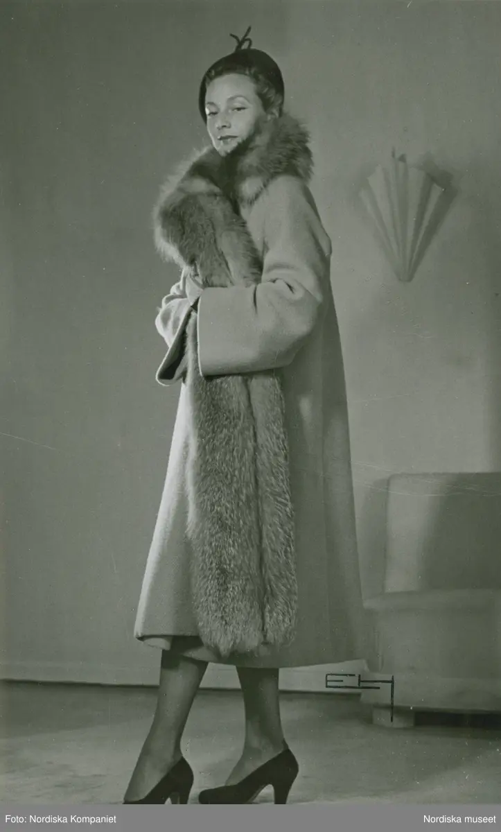 Modell i kappa med pälsboa, hatt och pumps, av Edward Molyneux.