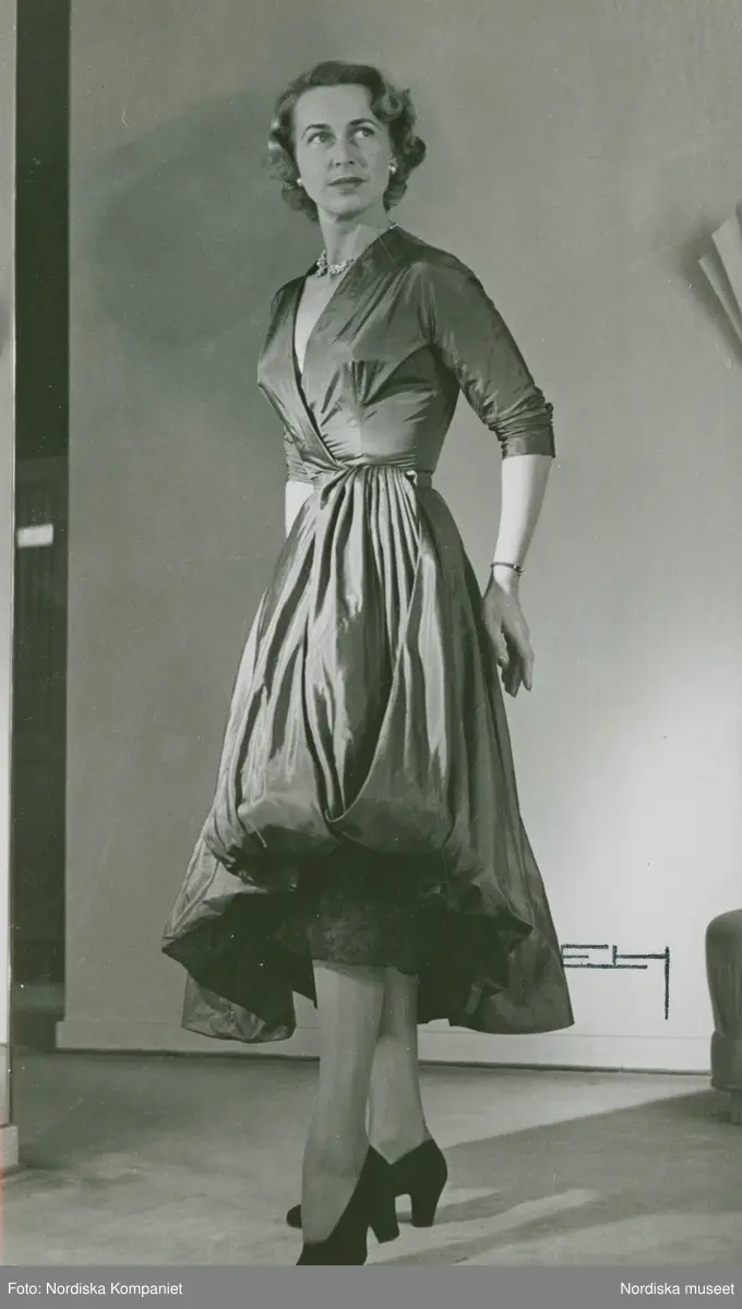 Modell i v-ringad klänning med underkjol i spets, halsband och örhängen, från Balenciaga.
