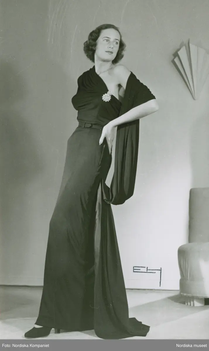 Modell i aftonklänning med hängande sjal över axeln.