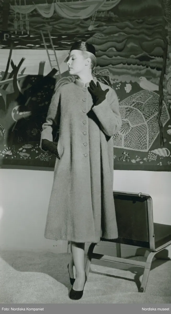 Modell i kappa, hatt, handskar och pumps. Textilkonstverk och fåtölj i bakgrunden.