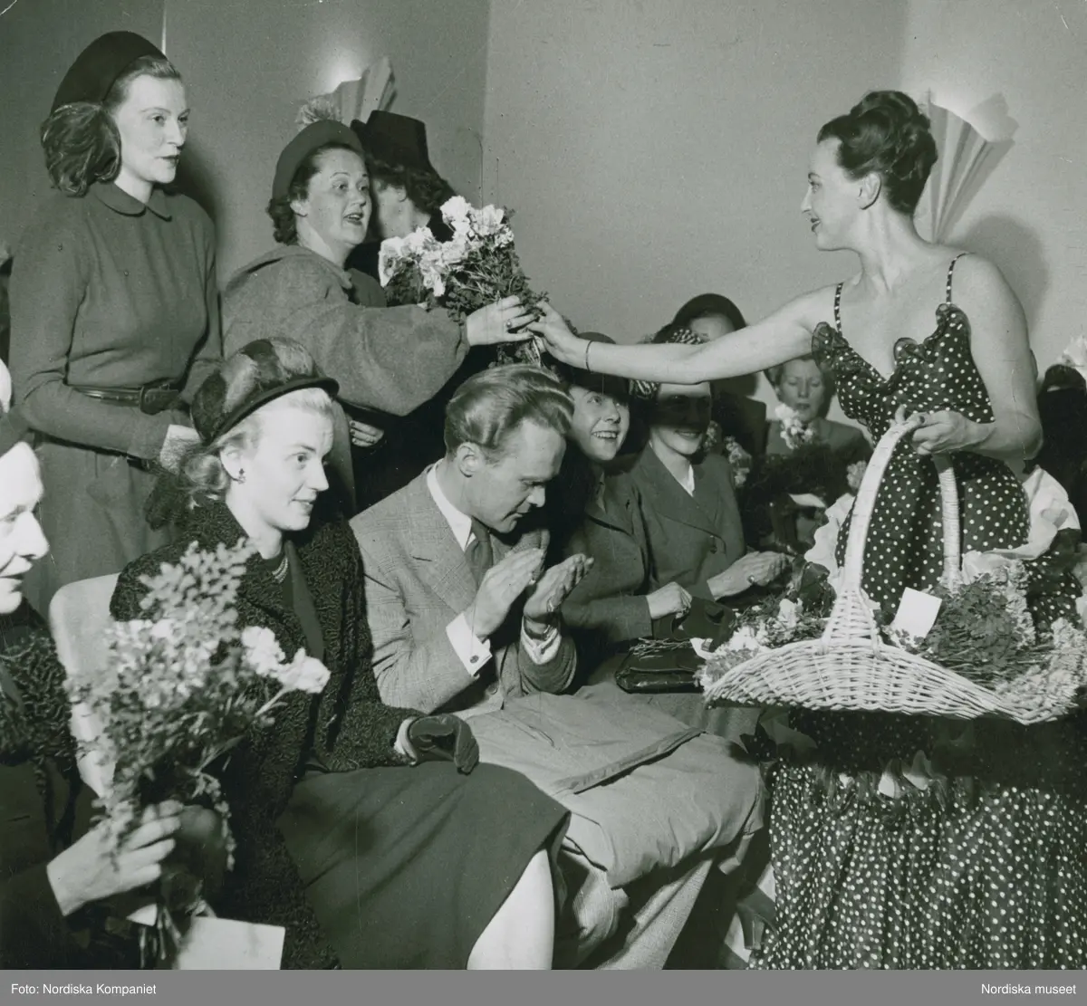 Modell i prickig klänning av Maggy Rouff, delar ut blommor till publik.