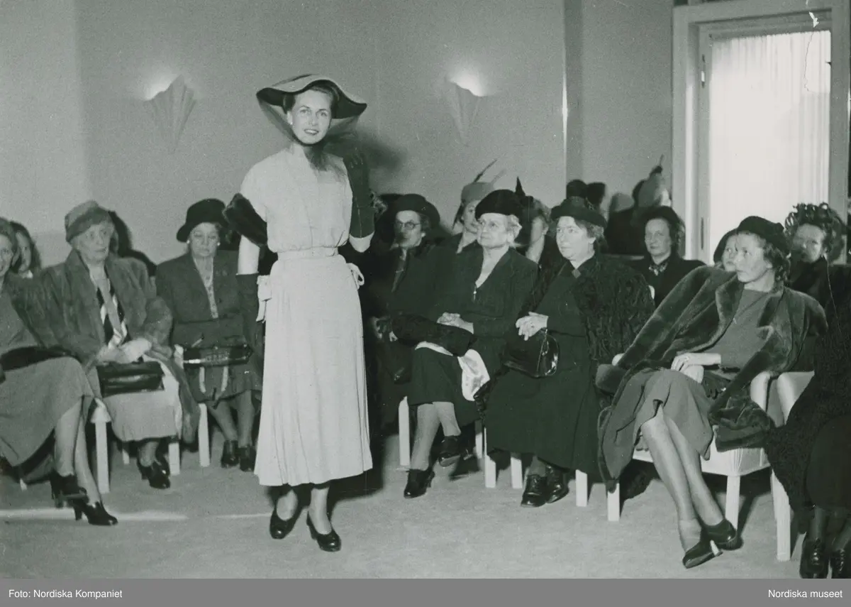 Modevisning, modell i klänning med päls, hatt med hakband, handskar och pumps framför publik.
