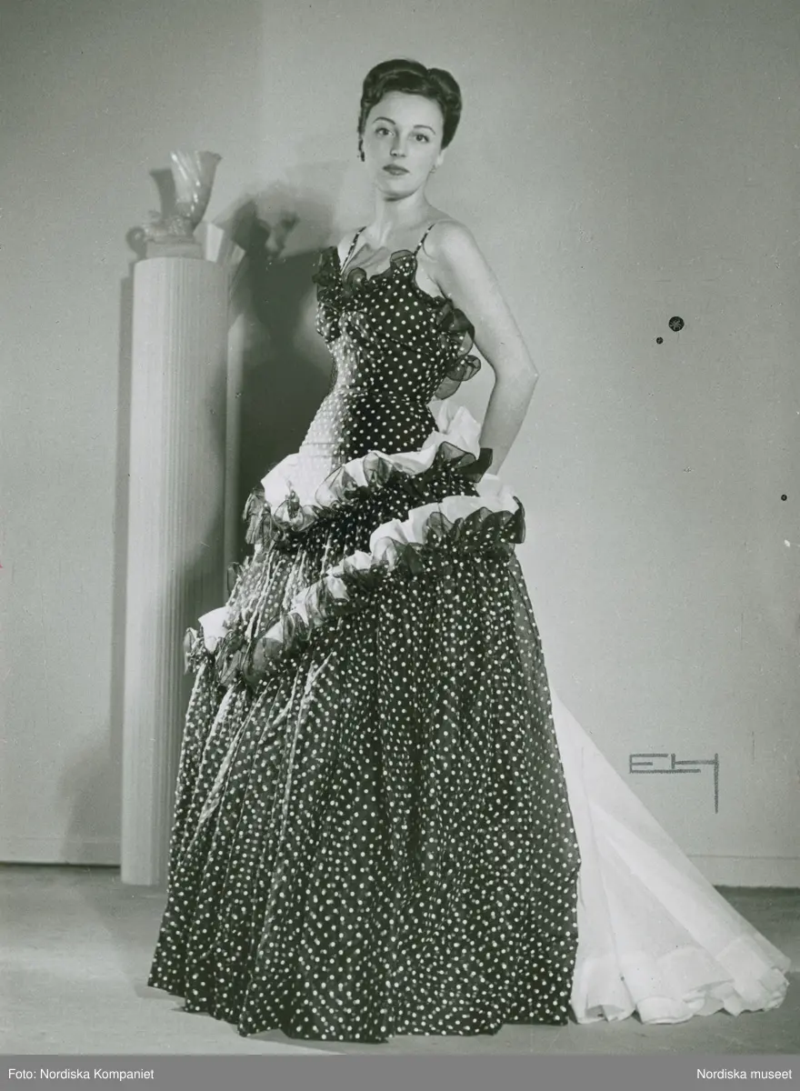 Modell i utställd, prickig klänning med volanger i tyll, av Maggy Rouff.