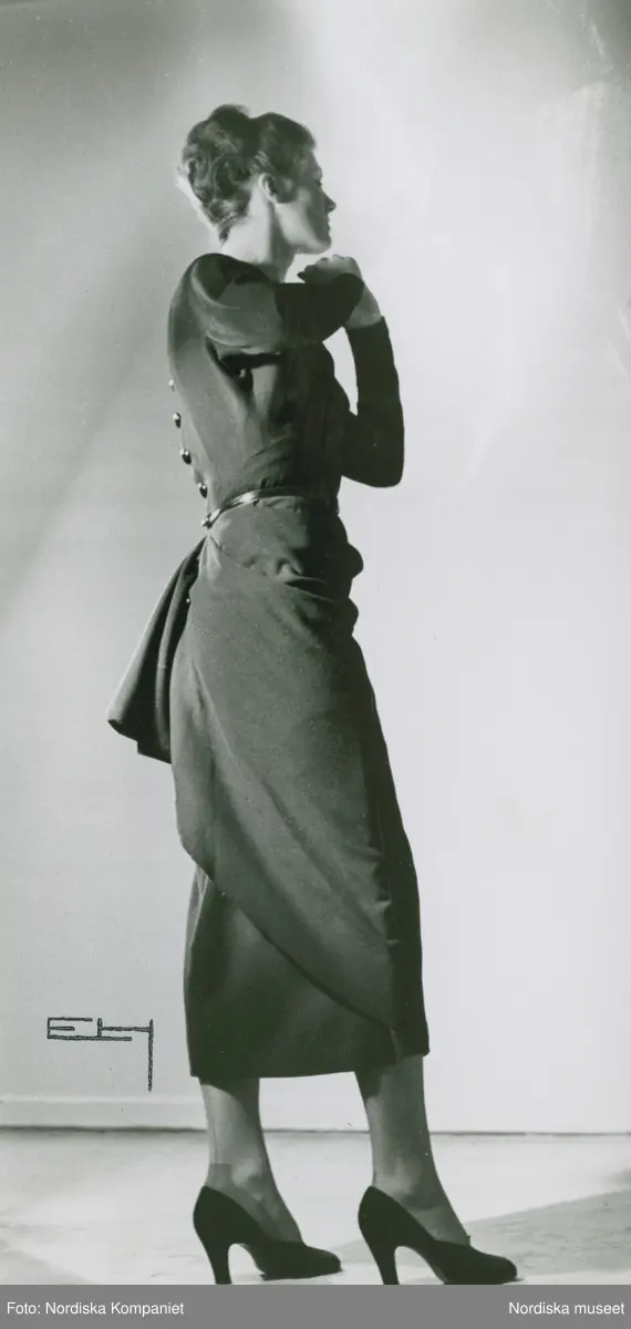 Modell i klänning med knappar i ryggen och pumps, från Robert Piguet.