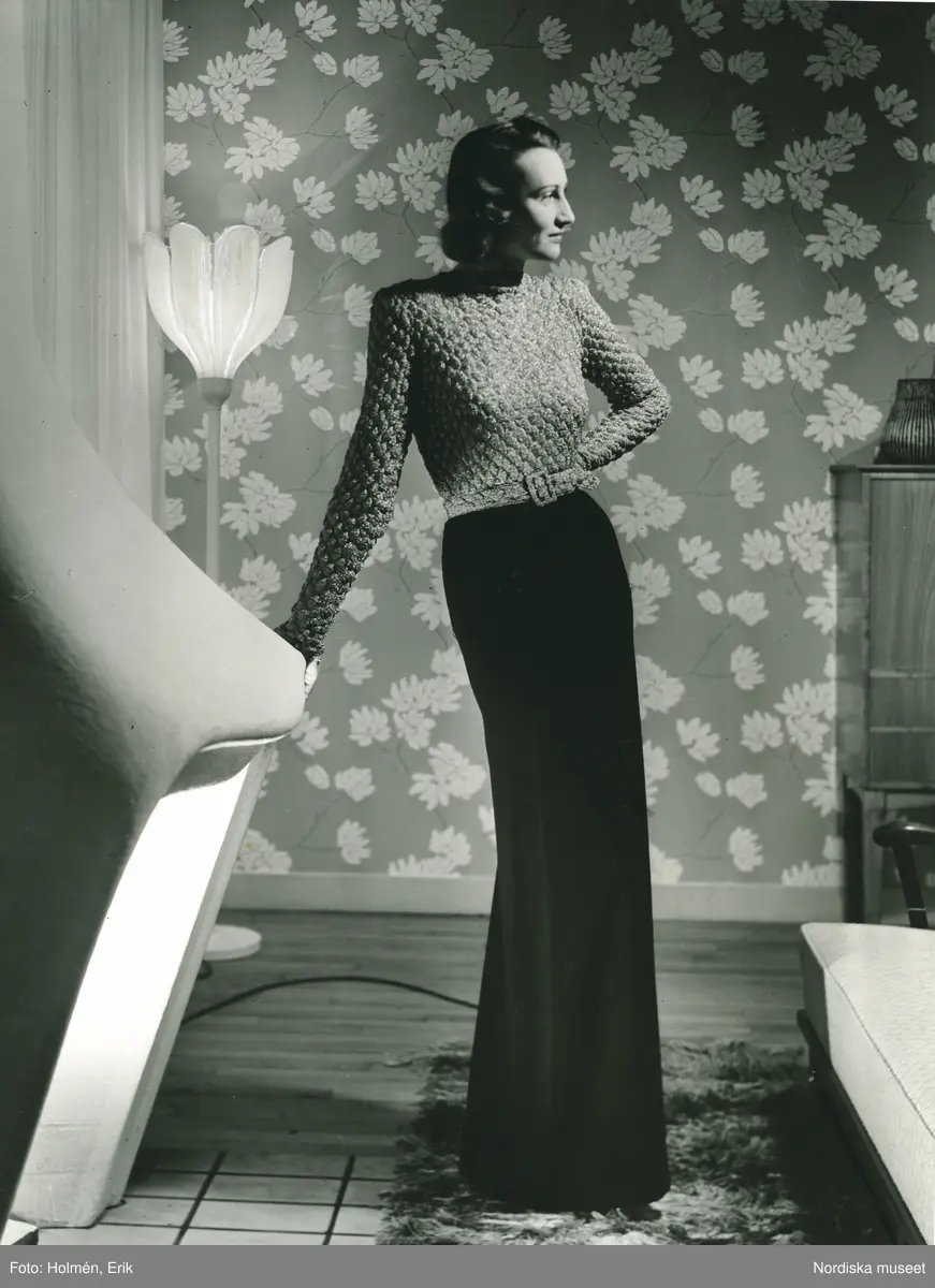 Helporträtt av en kvinna i hellång klänning med skärp framför blommig tapet.