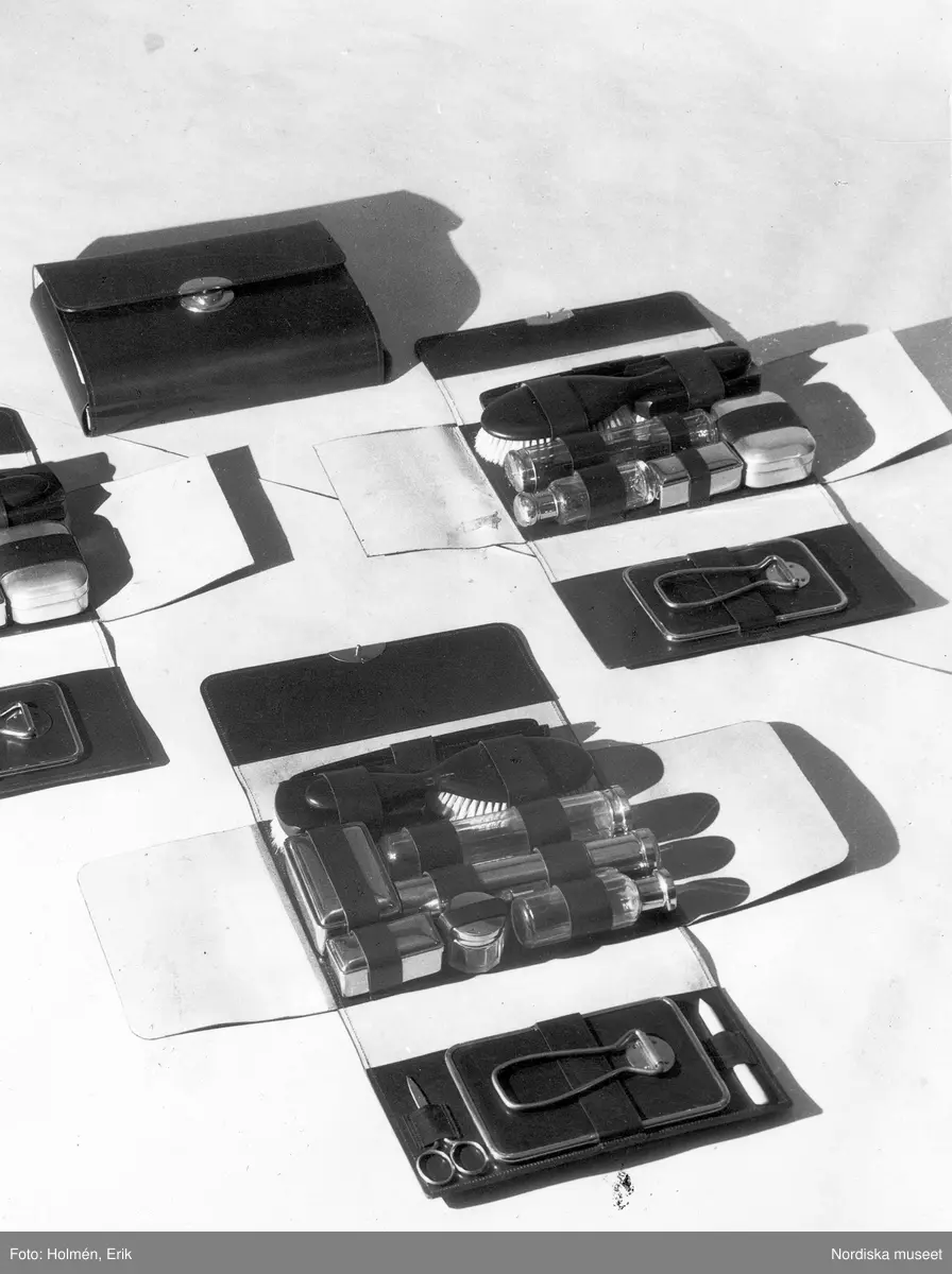 Reseffekter. Fyra uppslagna necessärer med hårborstar, flaskor, nagelsaxar och speglar.
