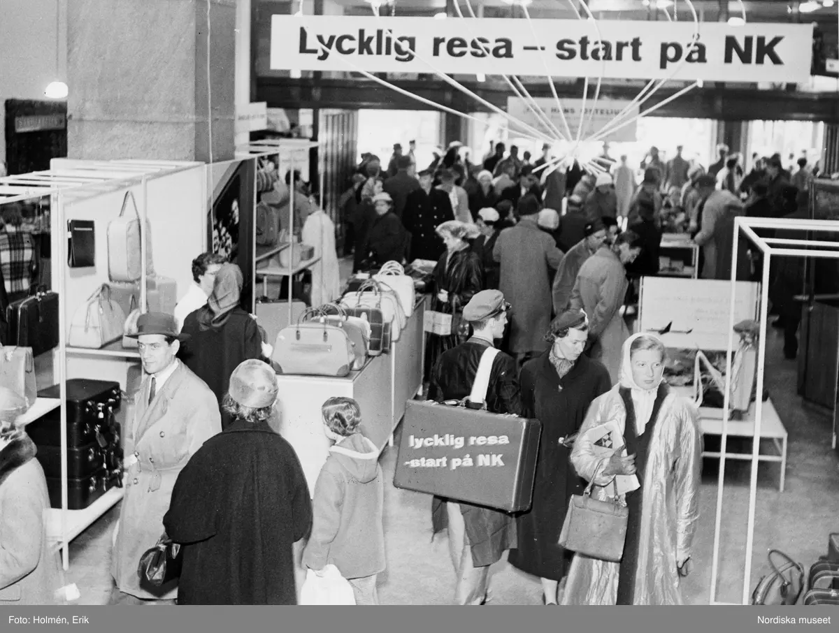 "Lycklig resa - Start på NK." Kunder tittar på resväskor på Nordiska Kompaniet.
