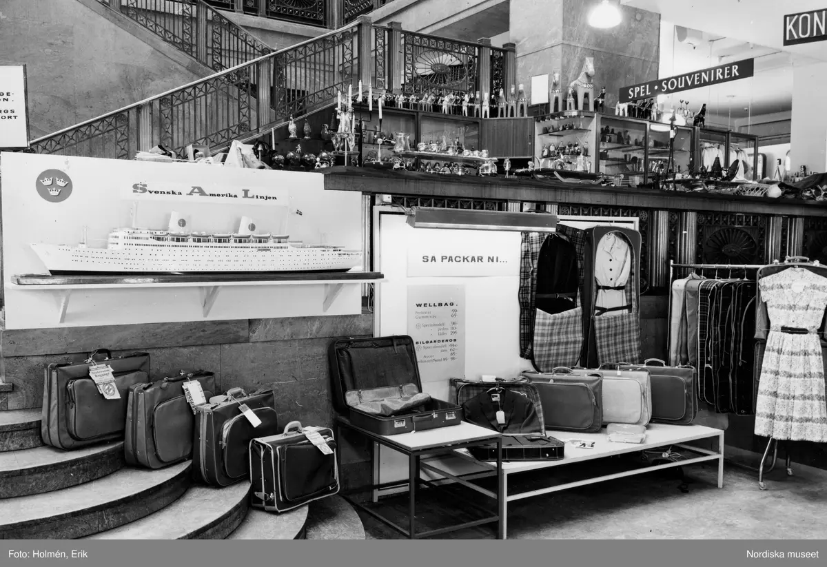 Reseffekter på Nordiska Kompaniet och båt från Svenska Amerika-Linjen.