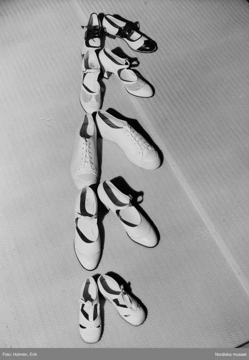 Fem par dam- och barnskor. Sandaler, gymnastikskor och klackskor.