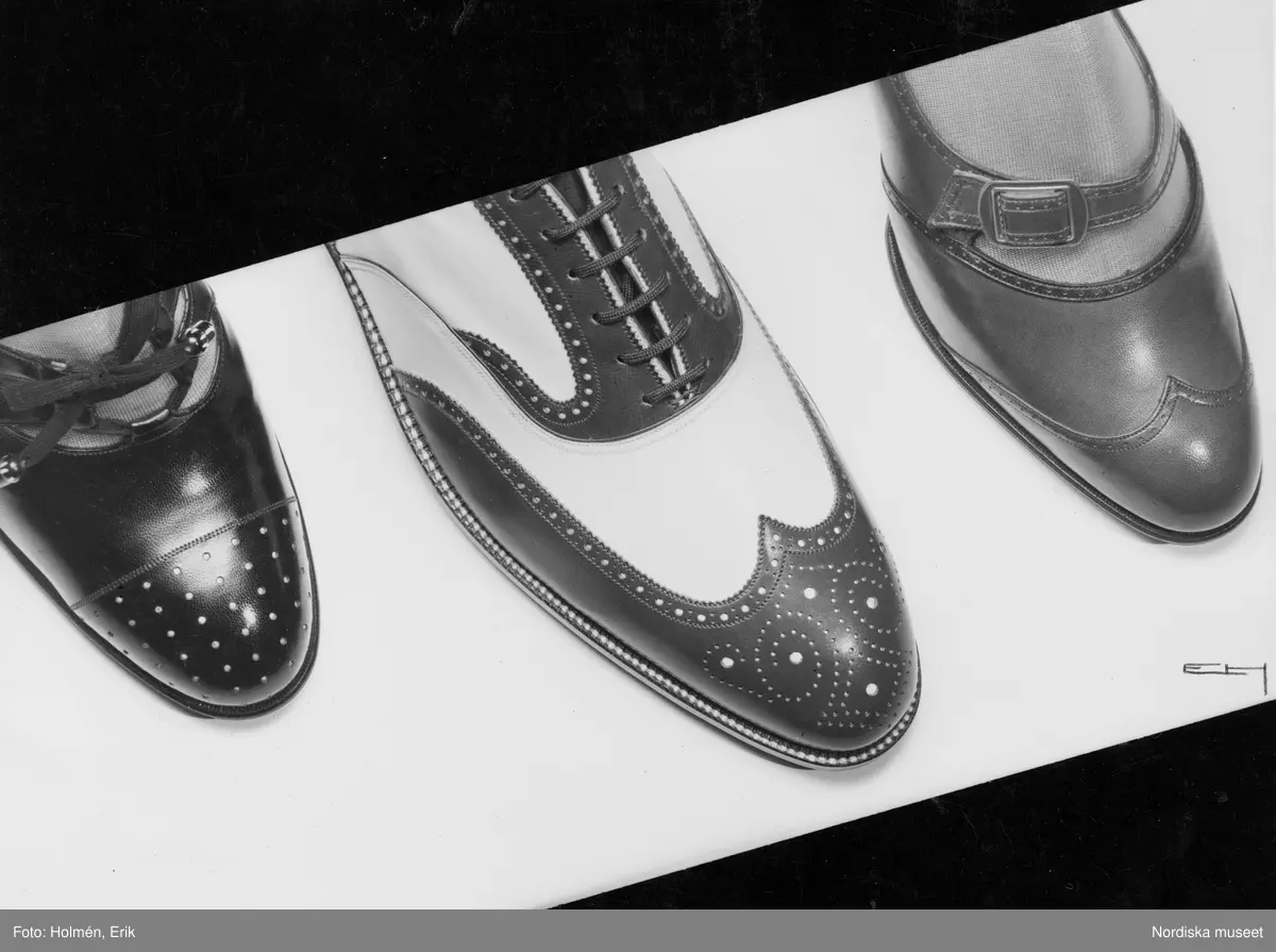 Tre skor i olika modell. Brogues i mitten, skor med perforerad tå och snörning till vänster och klackskor med spänne till höger.