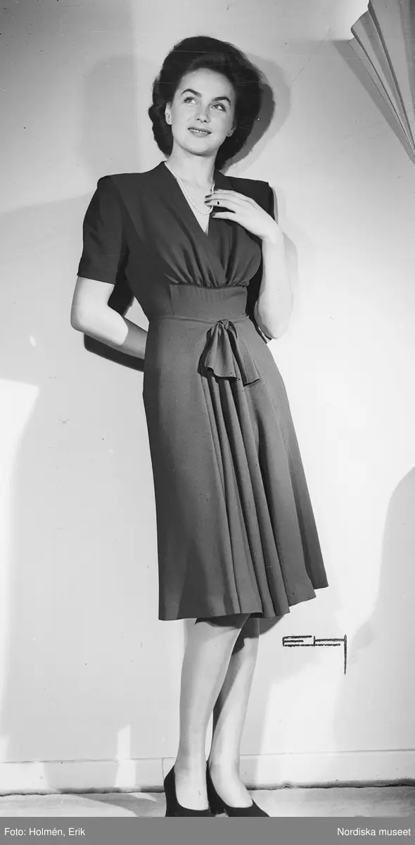 Modell i klänning med draperingar och band i midjan.
