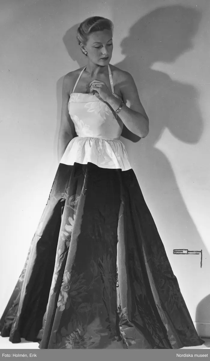 Modell i svart och vit aftonklänning med blommigt mönster. Från Edward Molyneux.