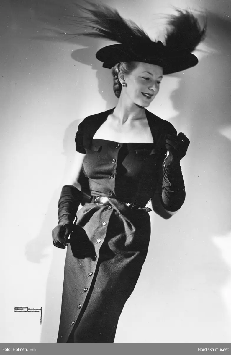 Modell i klänning med lackskärp, långa handskar och hatt med fjädrar. Från Lelong. Höst.