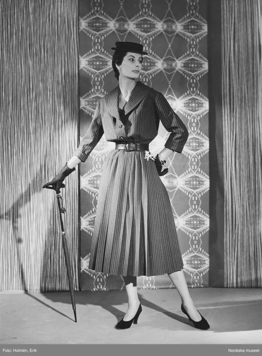 Modell i randig klänning med skärp, stråhatt, handskar, pumps och paraply. Liljekonvalj fäst i skärpet.
