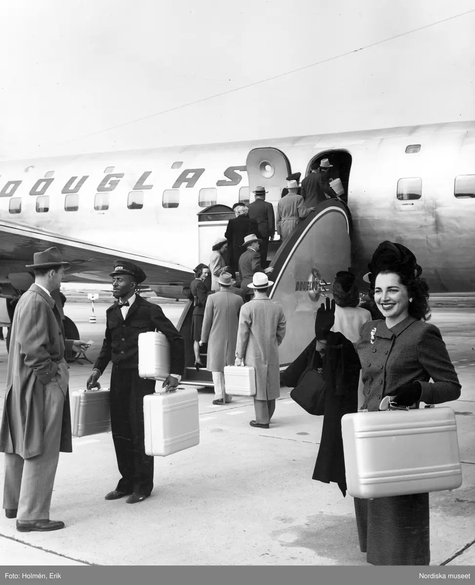 Passagerare och flygpersonal med resväskor i händerna, utanför flygplan. Douglas Aircraft.