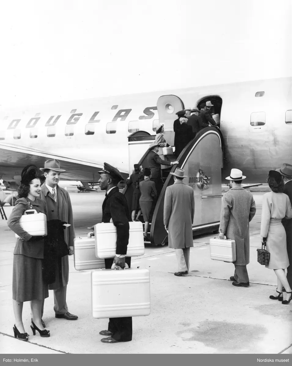 Passagerare och flygpersonal med resväskor i händerna, utanför flygplan. Douglas Aircraft.