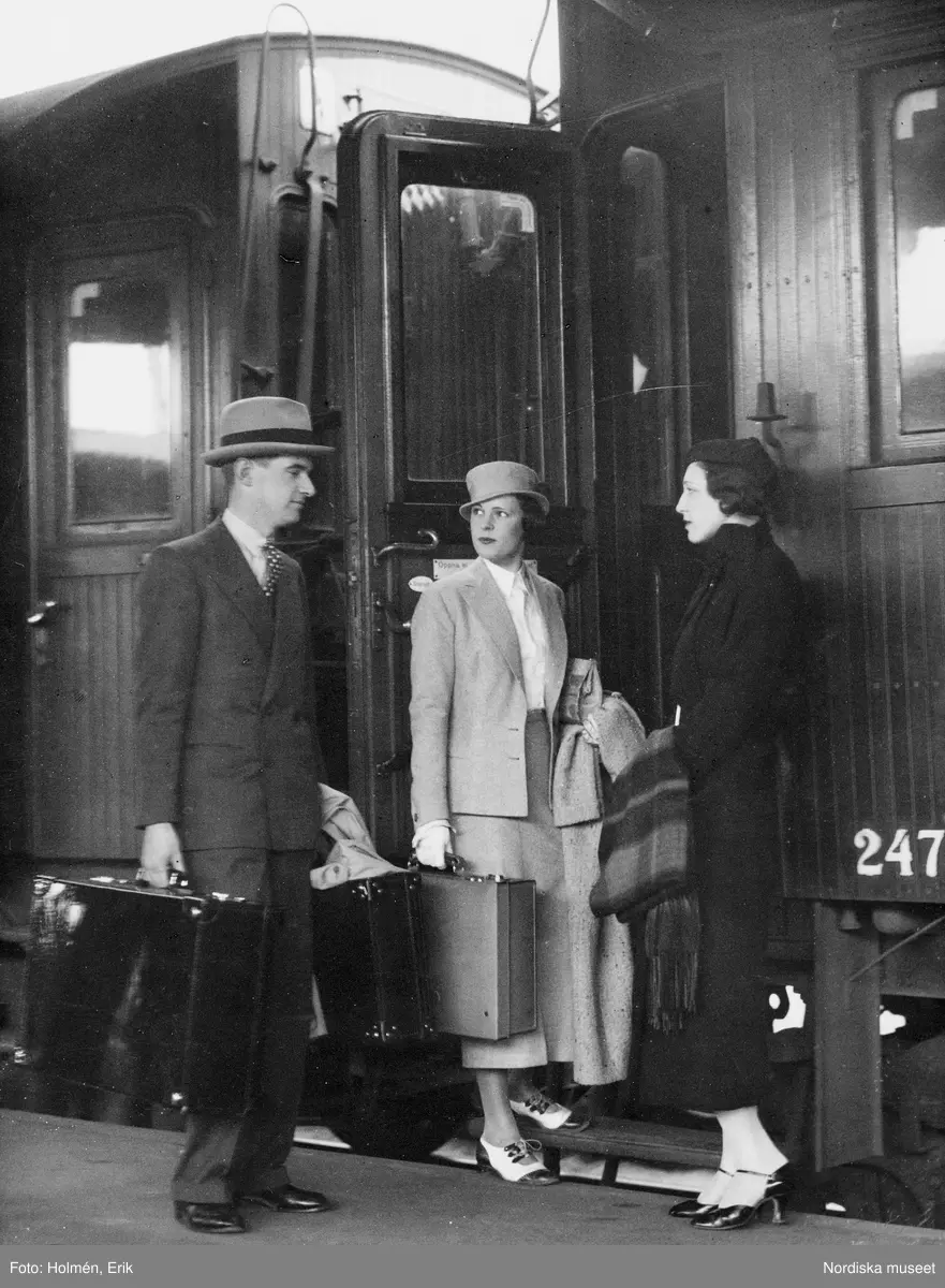 Två kvinnor i dräkt och kappa och en man i kostym med resväskor i händerna, går på ett tåg.