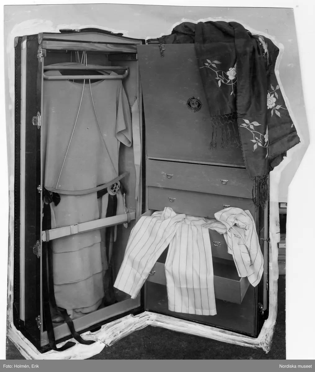 Reseffekter. En öppnad koffert med kläder, lådor och hängare i.