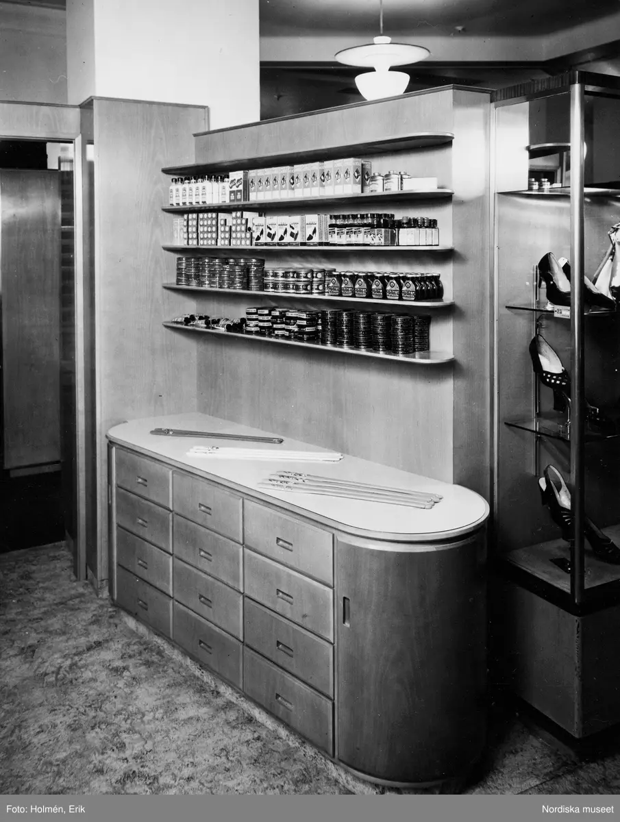 Interiör från Nordiska Kompaniet. Skoavdelningen, skoputs och andra tillbehör.