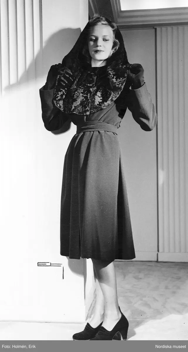 Modell i kappa med pälskrage över huvudet, handskar och pumps.