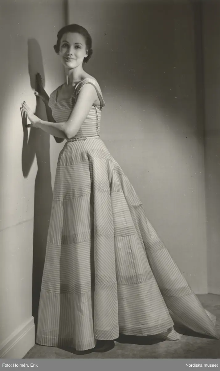 Modell i aftonklänning med ränder. Från L. Manguin.