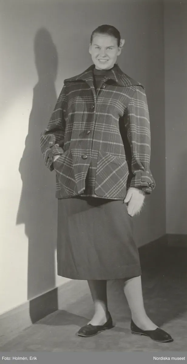 Tonårsmodevisning. Kvinna i rutig vinterjacka, kjol och tumvantar.
