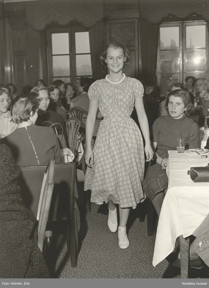 Tonårsmodevisning. Modell i rutig klänning, vitt halsband och vita strumpor och skor. Publik vid bord.