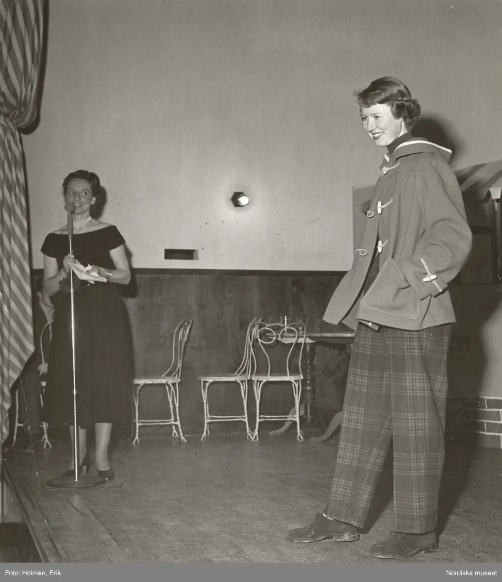 Tonårsmodevisning, Östra Real. Modell på scen i duffel och rutiga byxor. Kvinna pratar i mikrofon.