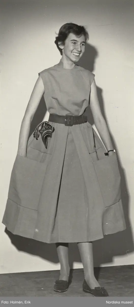 Tonårsmodevisning. Modell i klänning, skärp och scarf i fickan.