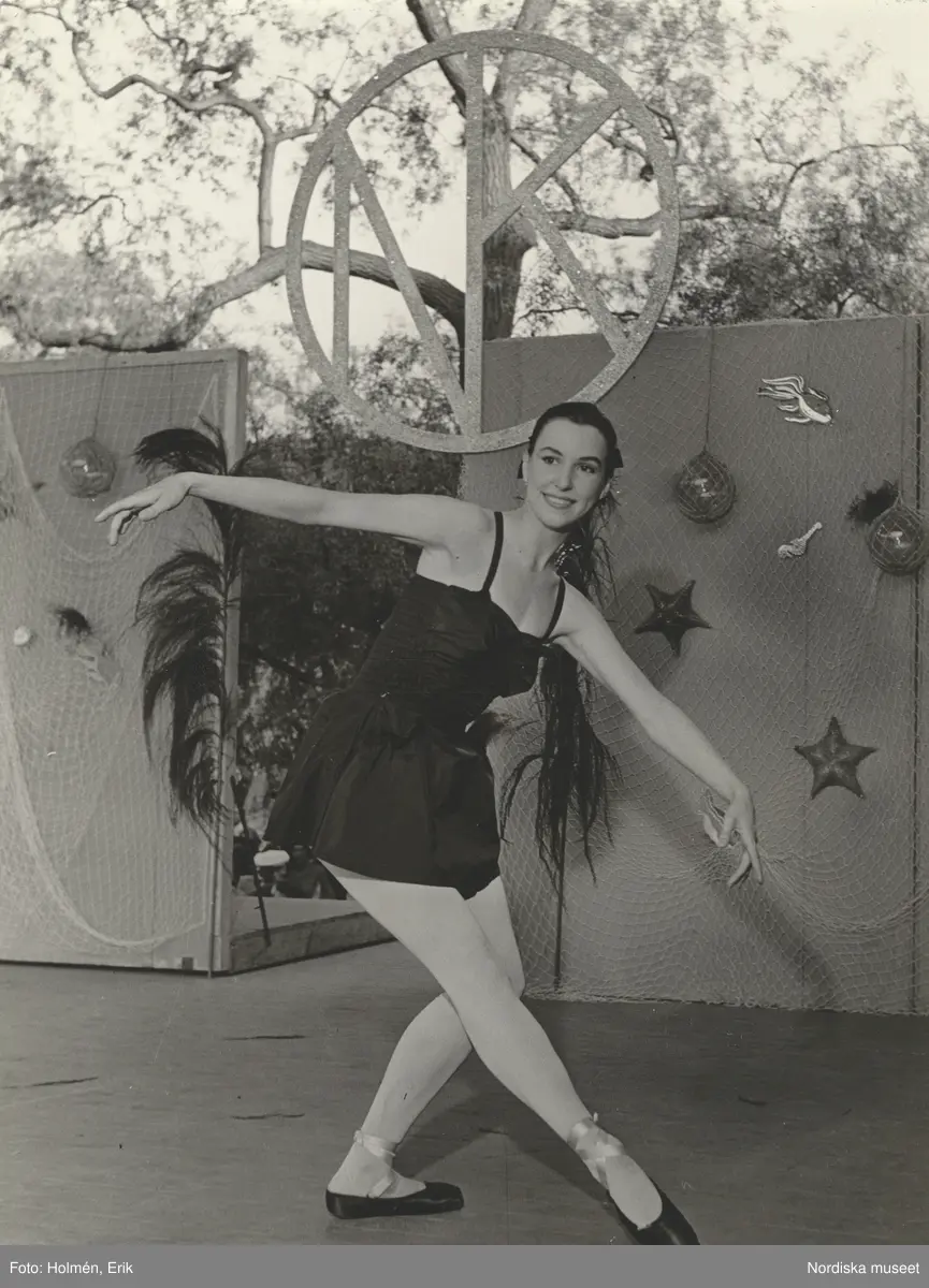 Marianne Orlando visar strandkläder i Kungsträdgården i Stockholm. Klänning och tåspetsskor. NK-loggan i bakgrunden.